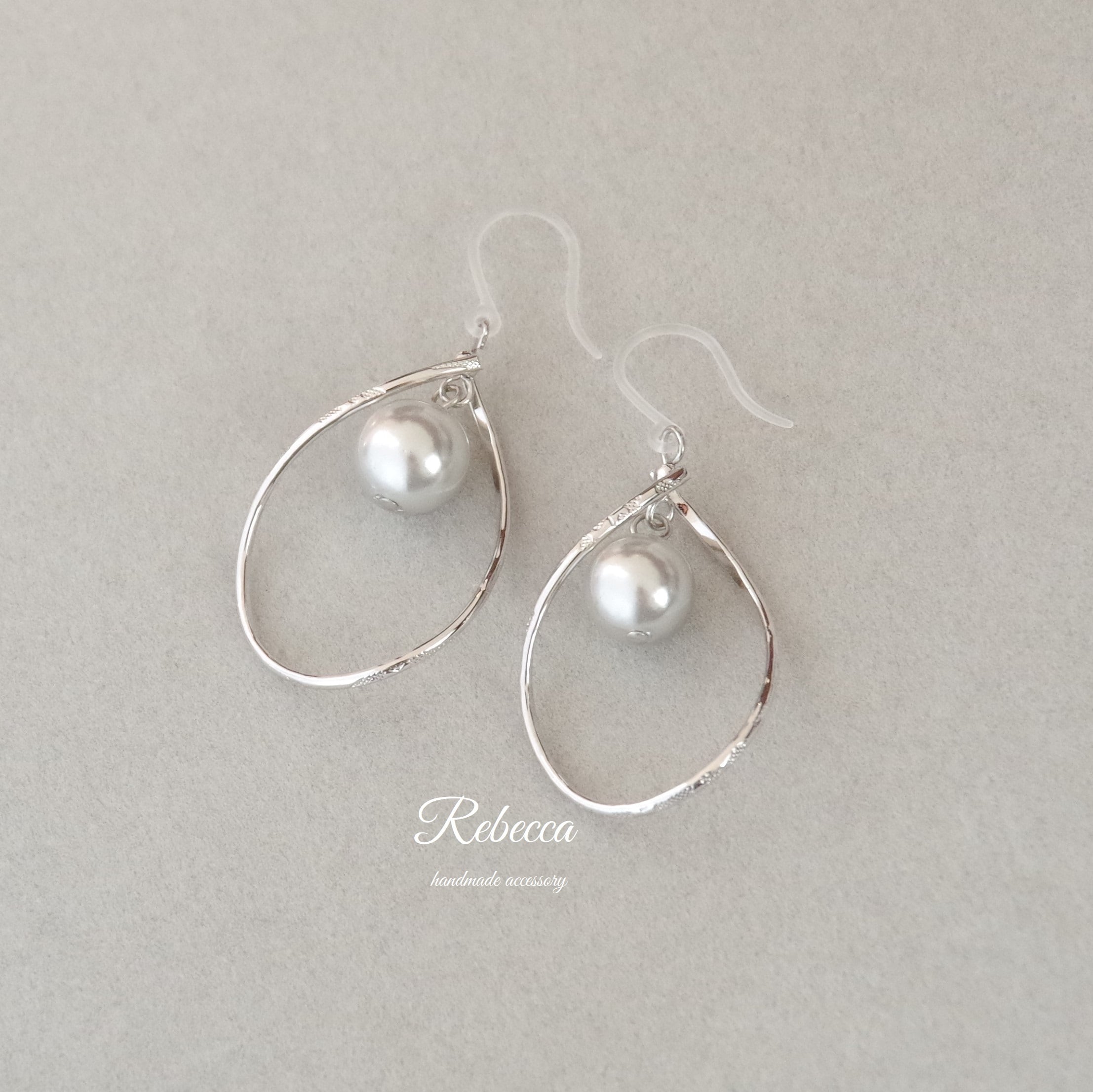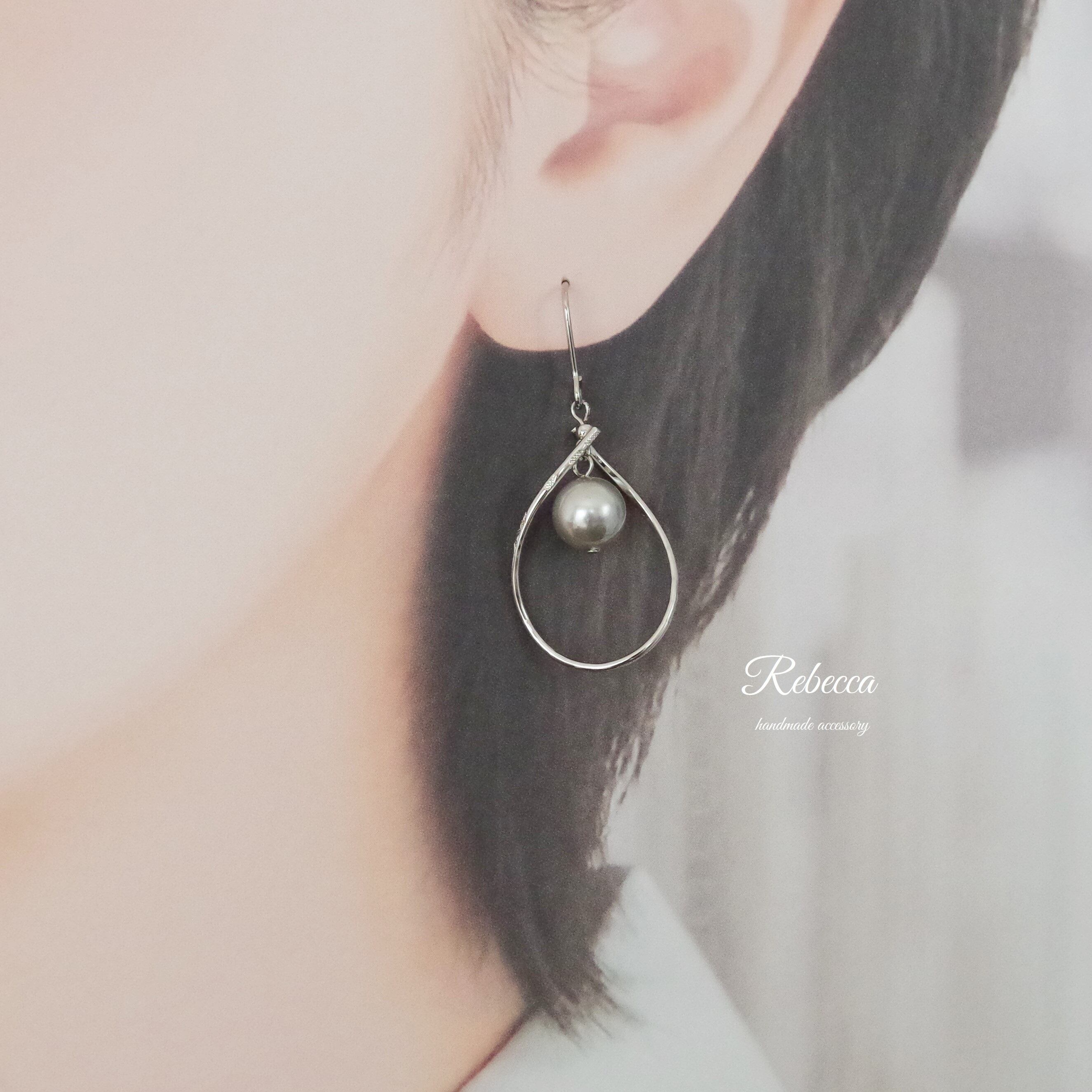 グレーの貝パール(シェルパール)がシルバーのドロップの中で美しく揺れるピアス/イヤリングです。