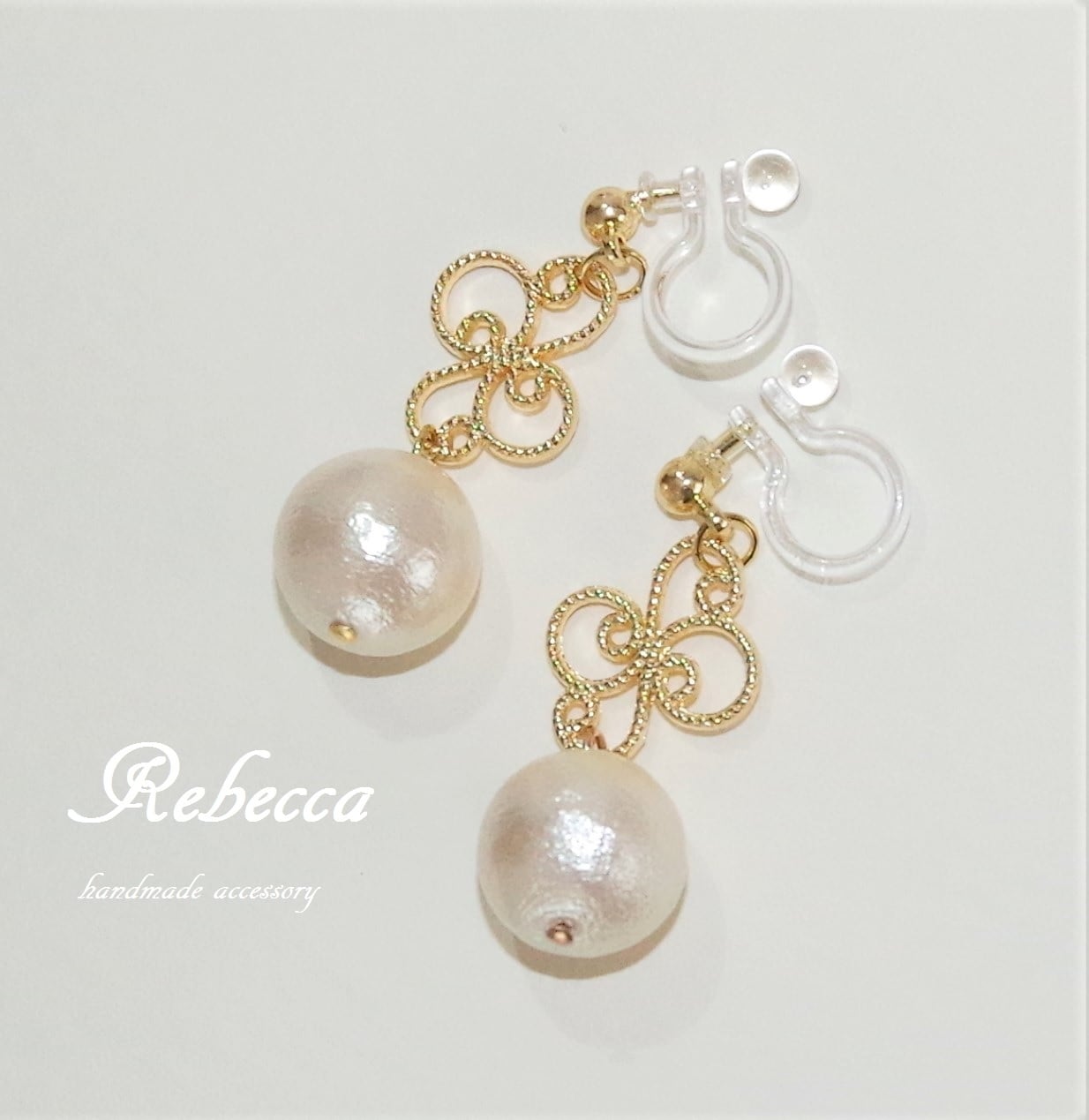 上品なゴールドの曲線モチーフに、大きめコットンパールを添えました。