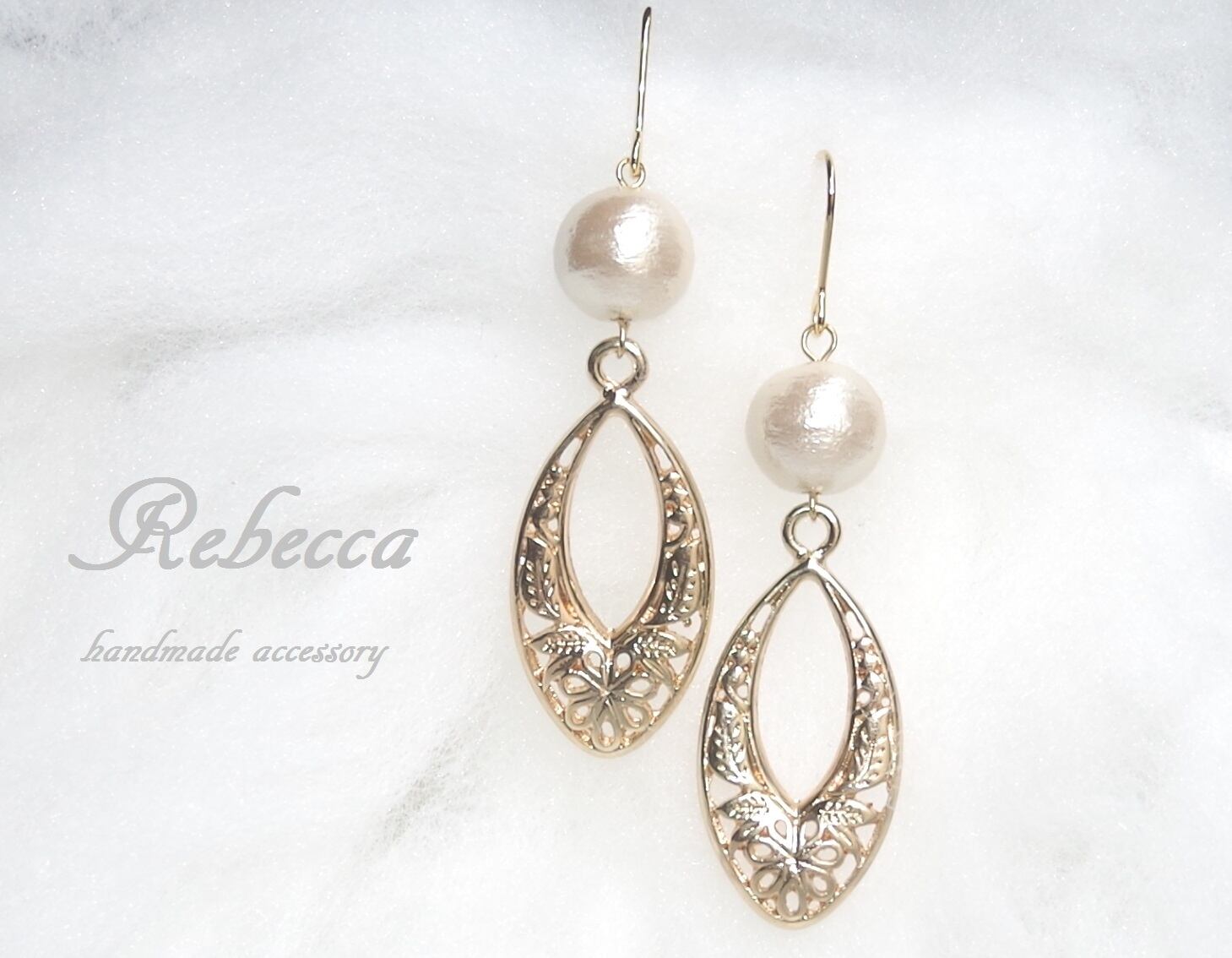 さり気なくお花や葉が描かれている、ゴールドの可愛いマーキス型モチーフに、上品で柔らかい雰囲気を醸し出してくれるキスカ色のコットンパールを添えました。